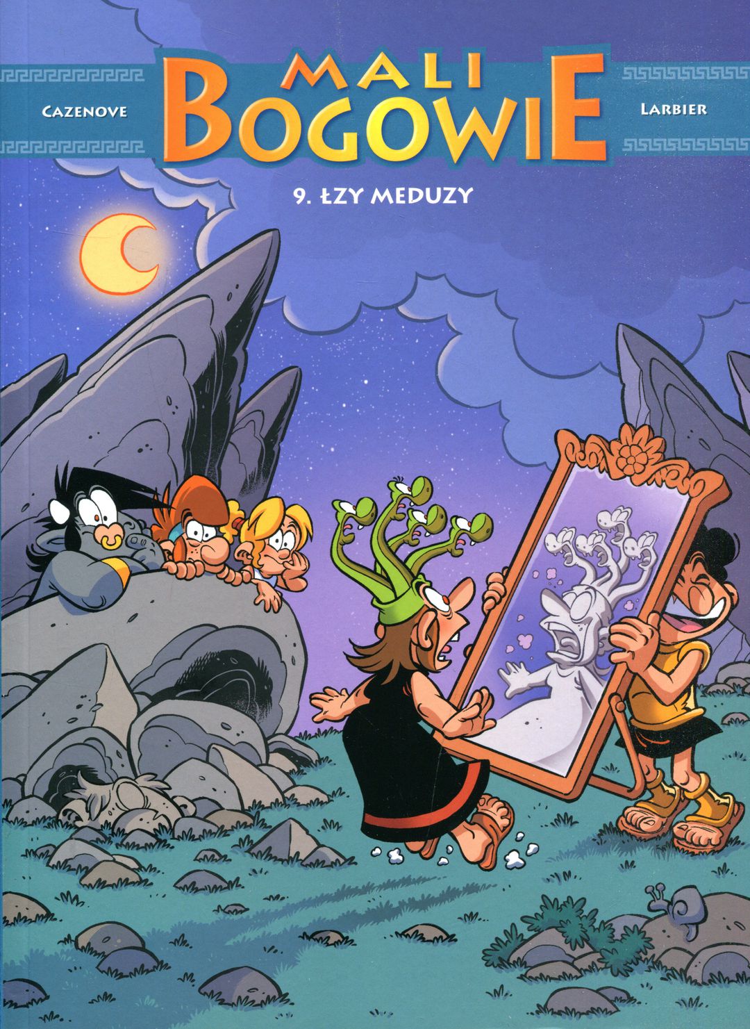 Meduza jest załamana tym, że każdy człowiek, który spojrzy jej w oczy, zamienia się w kamień. W dodatku pojawia się Perseusz z zadaniem zdobycia głowy sympatycznej wężowej potworzycy. Na szczęście śmiałek nie grzeszy skutecznością. Jak zwykle rozśmieszą nas też żarłok Taurusek, nieporadny Herakles, nieznający się na żeglowaniu Odyseusz czy pomysłowy wynalazca Hefajstos. Autorami historii o psotnych istotach z mitów są sc